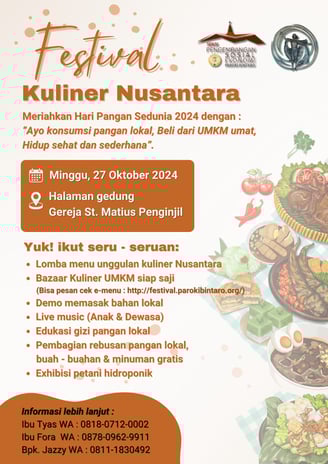 Saksikan lomba kuliner nusantara & Nikmati kelezatan kuliner pangan lokal dan hiburan seru di Paroki Bintaro, 27 Oktober 2024!